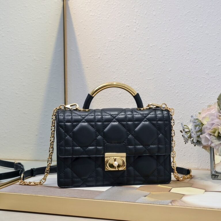 Start Dior’s new series with an elegant and fashionable aesthetic style. With oversized cannage topstitching, a stiff retro gold-finished metal top handle engraved with the Christian Dior Paris logo. The flap is decorated with a CD clasp embellished with resin beads. The silhouette with triangular lining is matched with two spacious compartments and an insert pocket, which can hold various daily necessities. The design is elegant. The adjustable and detachable chain shoulder strap is composed of gold-finished metal CD chain links embellished with resin beads. It can be carried by hand, on the shoulder or crossbody.