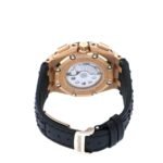 The AP Montoya Replica is a 1:1 super clone Swiss mechanism watch from Audemars Piguet’s Royal Oak Offshore family. It features an automatic movement with caliber AP 2226 / 2840 and a power reserve of 60 hours. The watch is certified within COSC limits for precision of -3/+3 sec/day and has a sweep motion second hand. The case is made of 904L stainless steel in a rose gold and transparent color. with a black bezel. The bracelet is made of leather with grid stitching. adjustable links. and a 904L stainless steel fold clasp.