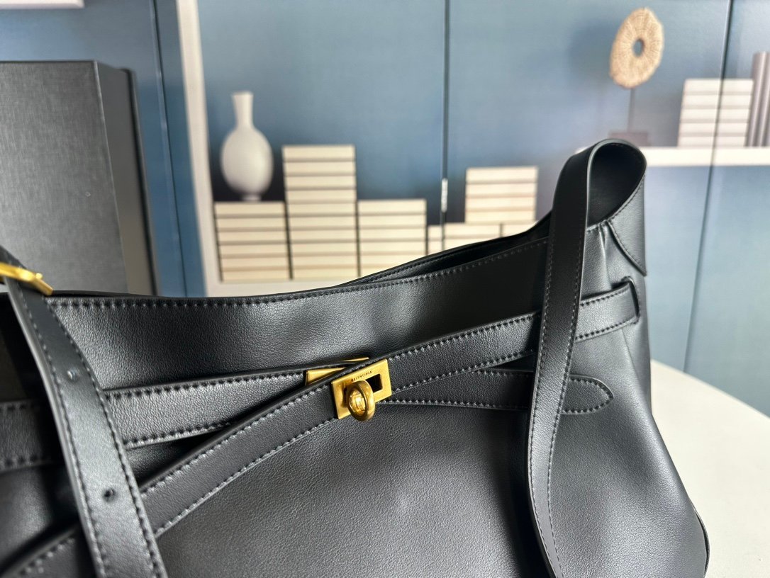 New Balenciag Winter 24 series Re-see handbag, single-shoulder bucket bag, made of top-layer cowhide with visible texture. It uses original hardware and is minimalist, high-end and atmospheric. A handbag transformed from a motorcycle glove. Hanging on it is the fashion recreated with a key ring buckle. It gives off a lazy and御姐风 (domineering female style) look when worn. Size: 37x21x10.