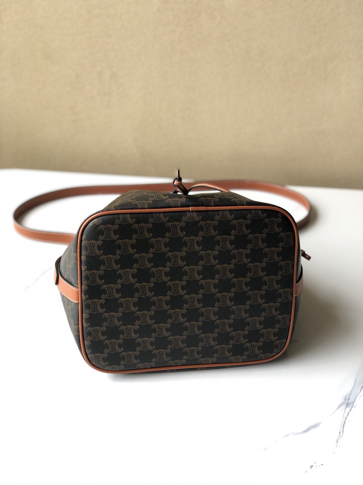 👑CELINE medium TRIOMPHE canvas drawstring bag, vintage crossbody. With internal label. 61% coated canvas, 39% calfskin. Crossbody and shoulder carry. Drawstring genuine leather strap. Adjustable leather shoulder strap. Length 50cm. Size: 24X27X19cm.