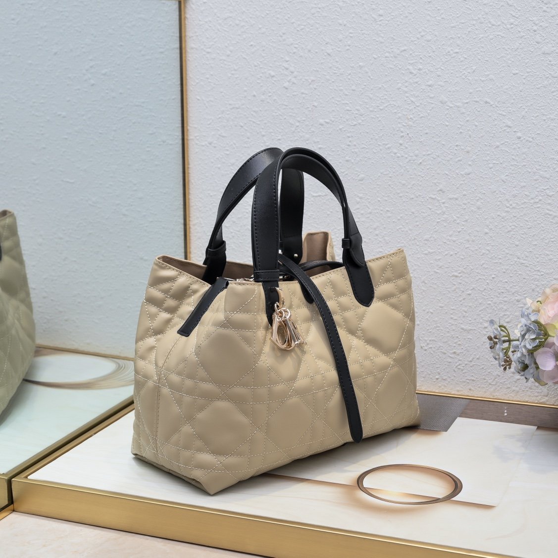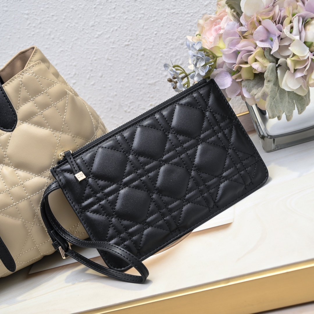This 28cm large Dior Toujours handbag is casual, practical and unique. It is carefully crafted from beige rope calfskin, decorated with oversized cannage topstitching and black calfskin details. The spacious interior compartment comes with a matching pouch for neatly storing various daily necessities. It features a slender leather drawstring closure for safely storing various items. There is also a CD Lock letter D knob-type buckle that can adjust both sides to enhance the style. Medium size. The leather top handle has adjustable details and can be carried by hand or on the shoulder.