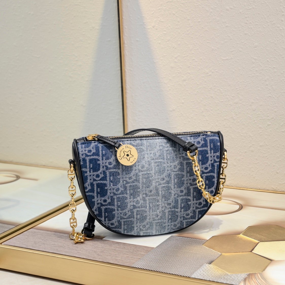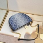 This callisto chain handbag is a new addition to Dior’s autumn collection, and it enhances the style of the collection with a stylish and elegant half-moon shape. It is carefully crafted in blue oblique print and embellished with the same tone of cow leather detailing. The zipper is designed to open and close, with a circular plaque engraved with the logo and star symbols, and the spacious compartment is equipped with multiple card slots. CD chain link chain is decorated with resin beading and paired with a leather strap for even more comfort on the shoulder. Dimensions: 20x14x4 cm