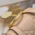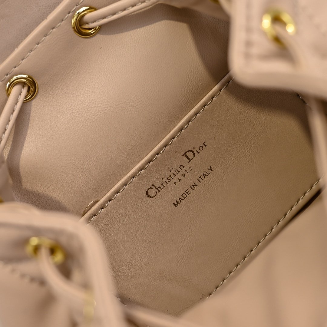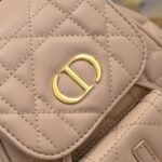 Small size. This Dior Caro backpack is a new product of the early spring ready-to-wear collection in 2025, showing a fashionable and elegant style. Meticulously crafted, it is paired with oversized cannage topstitching to enhance the style. The flap is decorated with a retro gold-finished metal CD logo. After opening, there is a drawstring main compartment. The small flap pocket can hold various daily necessities. Paired with a gold-finished handle and an adjustable shoulder strap for added comfort.