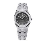 The Frosted AP Replica features a 41mm stainless steel case that exudes strength and durability. making it a reliable companion for any occasion. The stainless steel strap in a sleek silver color adds a touch of sophistication. perfectly complementing the dark grey dial. Designed to withstand the elements. this timepiece is waterproof. ensuring peace of mind even in adverse conditions.