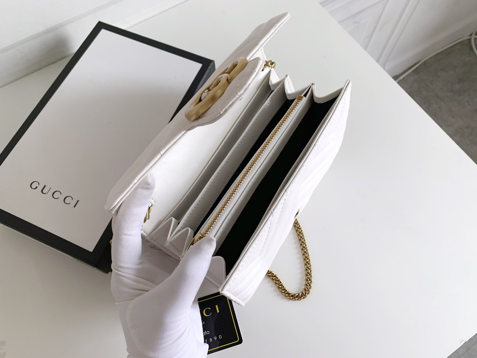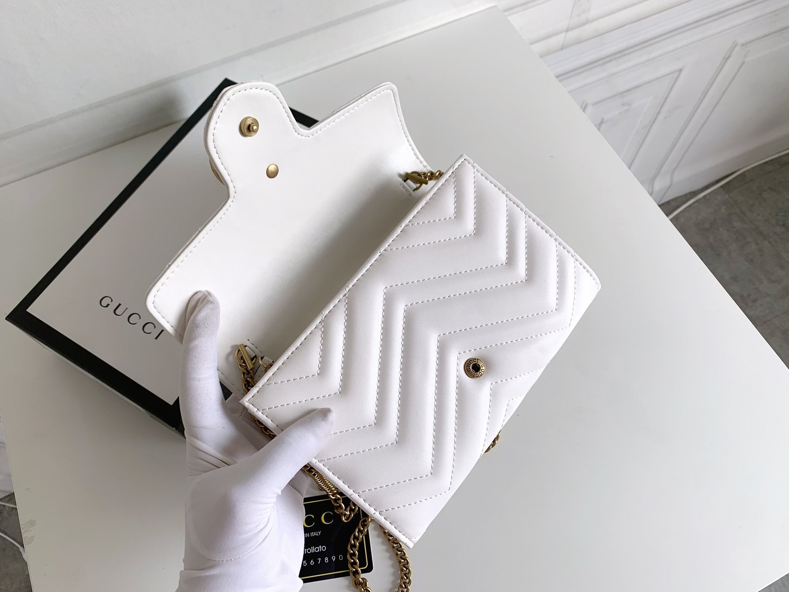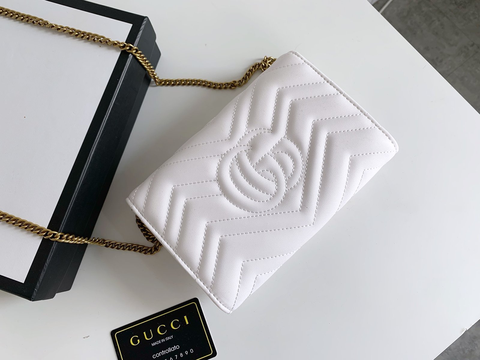 [G] 🔥🔥🔥 The Marmont mini chain bag features a rather structured soft shape.👏🏻 The flap is equipped with retro golden double G hardware.😍💋 The back is decorated with double G embroidery.🌹 It is made of quilted human-shaped Italian leather.👏🏻 Structured soft shape.👏🏻 Model: 47457520. Size: w20×h13×d6.