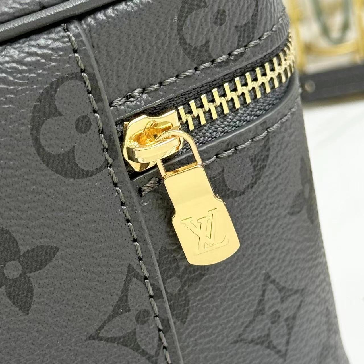 Drawing inspiration from the classic cosmetic case, the handbag interprets the spirit of travel in Monogram canvas. The top handle and removable braided chain blend in with leather elements to complement the concise lines of the bag body. The LV inscribed padlock and leather key bag continue the signature details. 19 x 11.5 x 6.5 cm