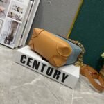 The handbag is from the brand’s collaboration series with Tyler. It presents a pocket-sized version of the Steamer handbag in Monogram Craggy canvas. The artist gives the Monogram pattern a hand-painted look. Cowhide leather shapes and reinforces the corner guards, shoulder strap, and flap.