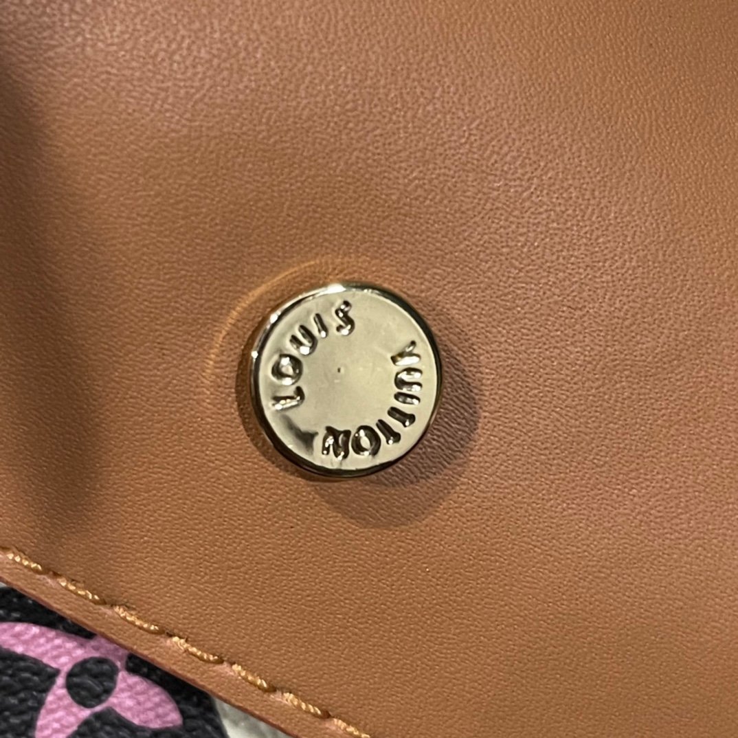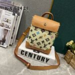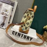 The handbag is from the brand’s collaboration series with Tyler. It presents a pocket-sized version of the Steamer handbag in Monogram Craggy canvas. The artist gives the Monogram pattern a hand-painted look. Cowhide leather shapes and reinforces the corner guards, shoulder strap, and flap.
