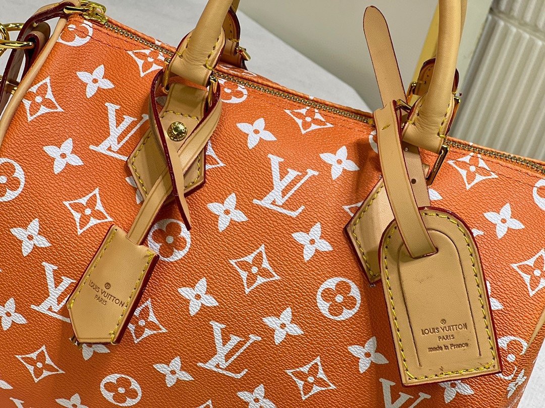This Speedy P9 Bandoulière 25 Monogram Leather handbag is made of soft cowhide leather and reproduces the refined look of canvas printing with the Monogram pattern. Dazzling metal pieces, sheep leather lining and nameplates together confirm the unremitting pursuit of details by creative director Pharrell Williams. Size: 25x15x15cm.