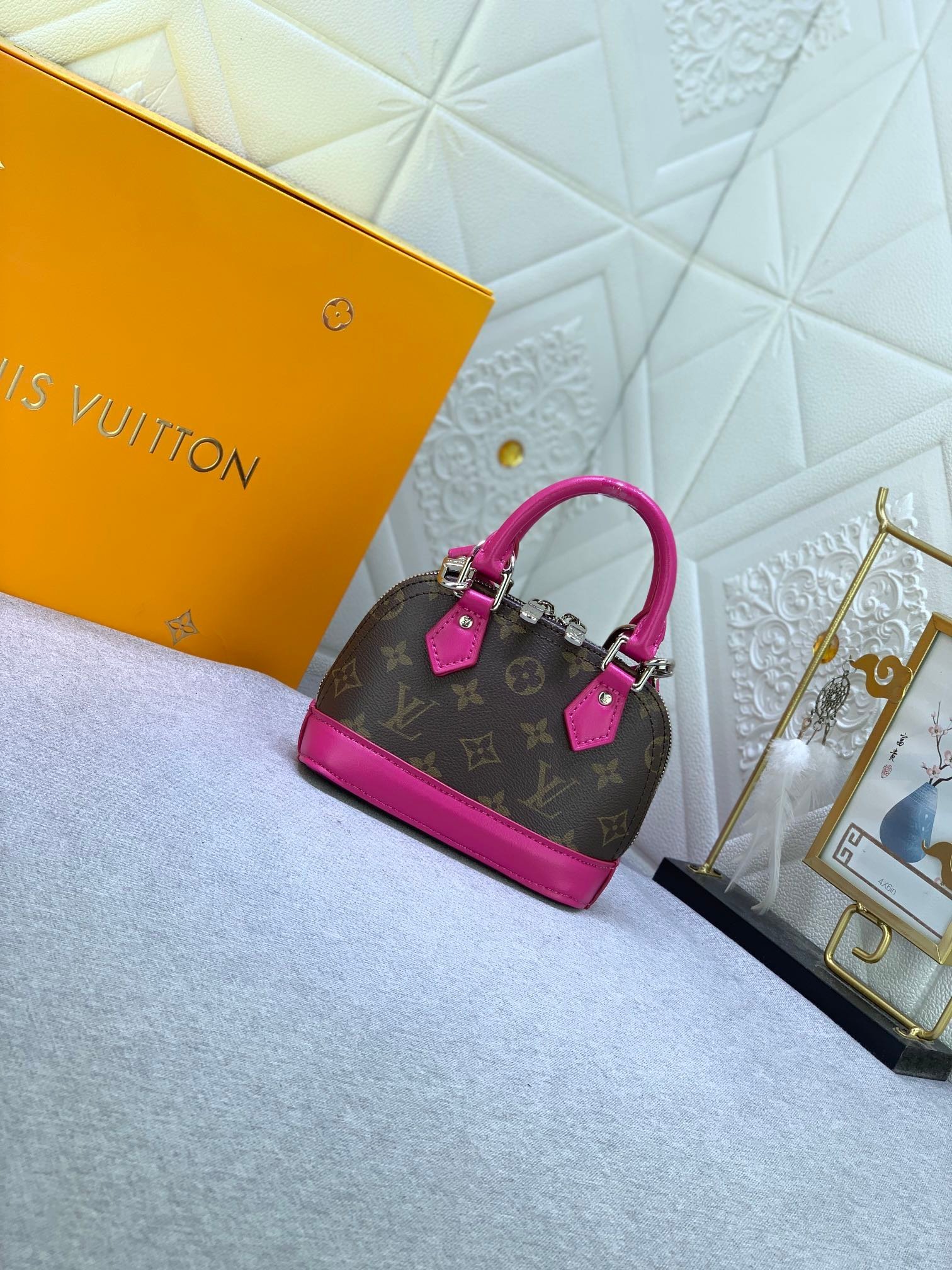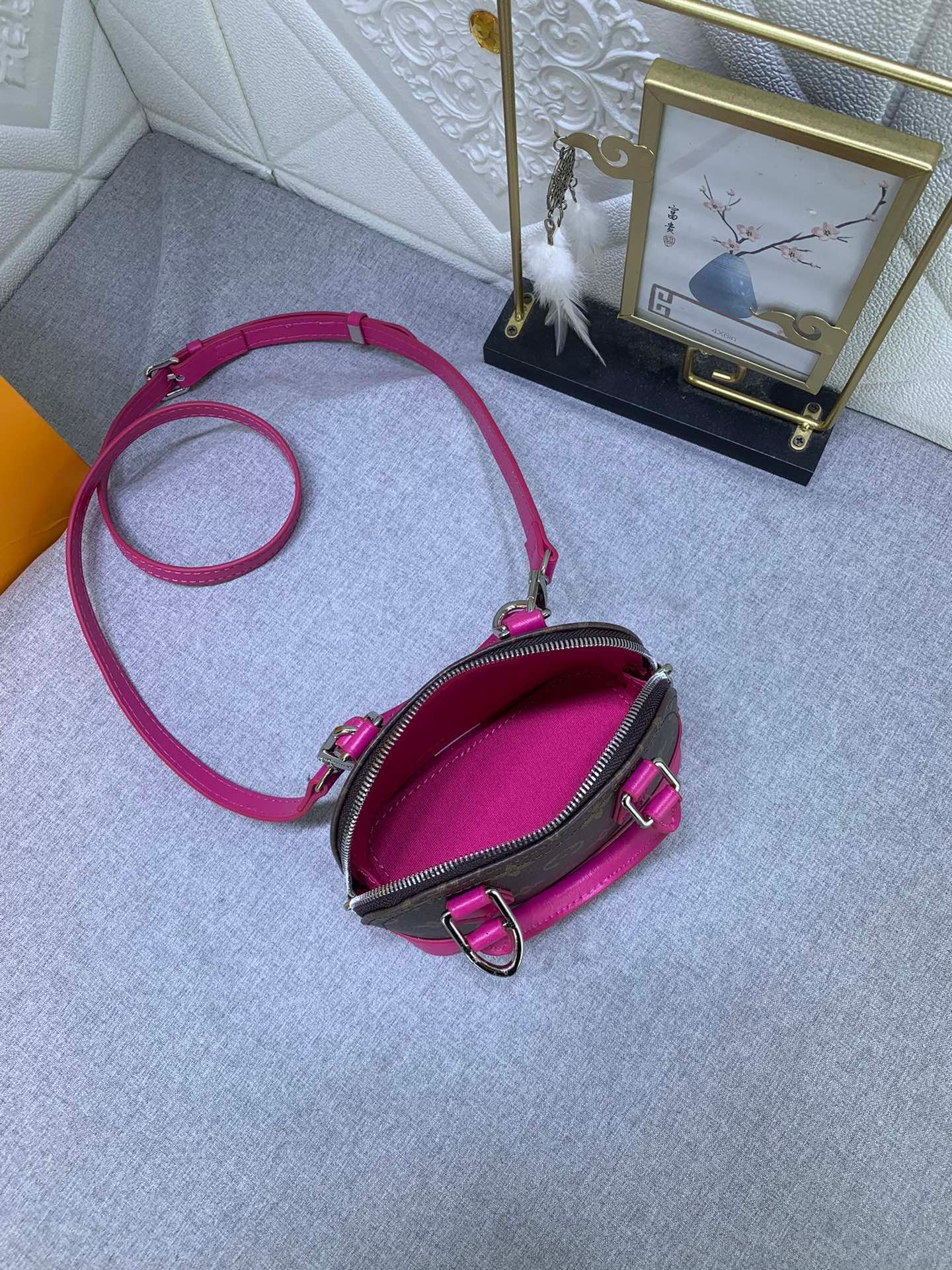 Mini shell bag series. New launch Nano Alma handbag. The Nano Alma reproduces the symbolic Alma bag in a miniature version. Louis Vuitton’s signature Monogram canvas material coordinated with decorations of natural leather. A delicately crafted item that combines traditional charm and modern functionality. When the double zipper is opened, the interior design with surprisingly ample storage space is revealed. With two leather handles and an adjustable and detachable shoulder strap, multiple styles can be created.