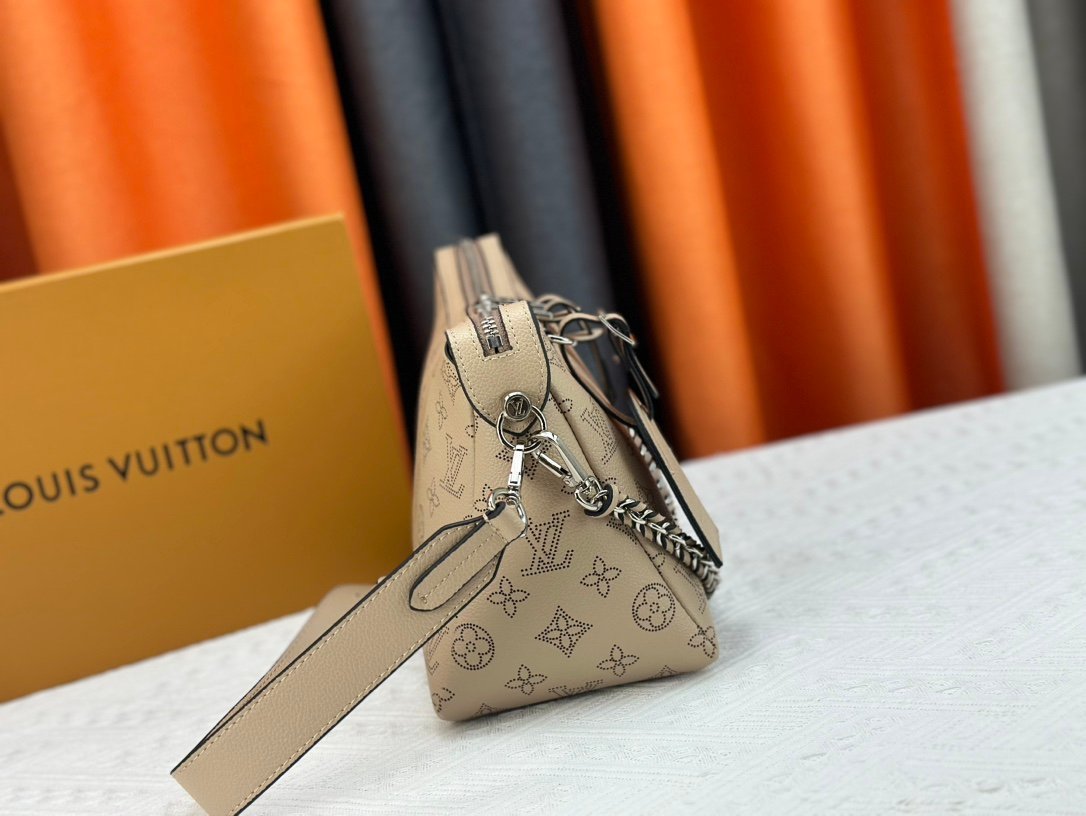 This Mahina Hand It All handbag is made of finely perforated cow leather to complement the chic contour of the bag with an elegant pendant texture. The leather shoulder strap and chain leather woven handle are removable, providing a trendy choice for everyday travel. Large 32.0 x 29.0 x 13.0 cm