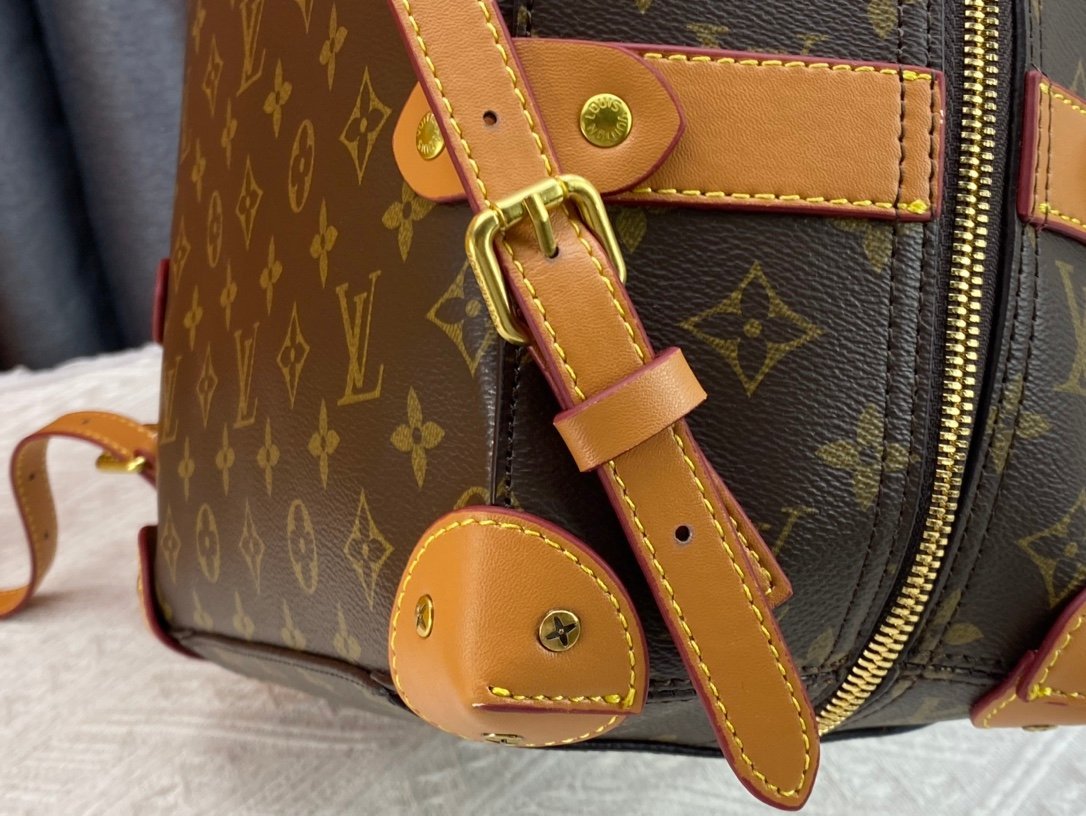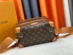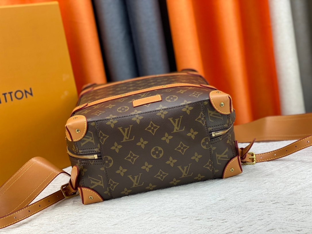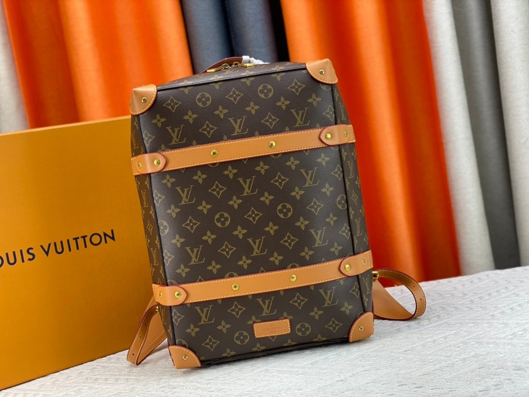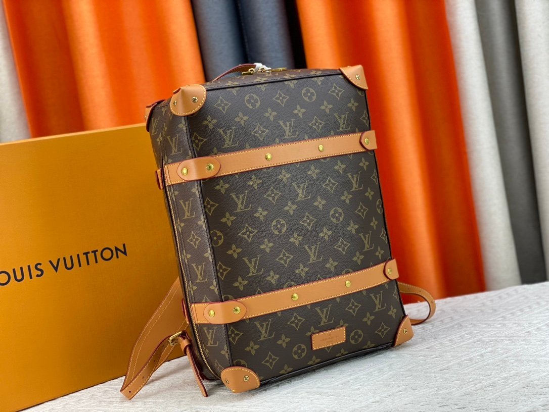 Retro trunk bag 44752 monogram. LV’s classic and refined trunk bag with fabric lining, antiqued gold metal parts, and full Monogram pattern. Zipper closure and adjustable leather shoulder strap. Size: 36*28*14cm.