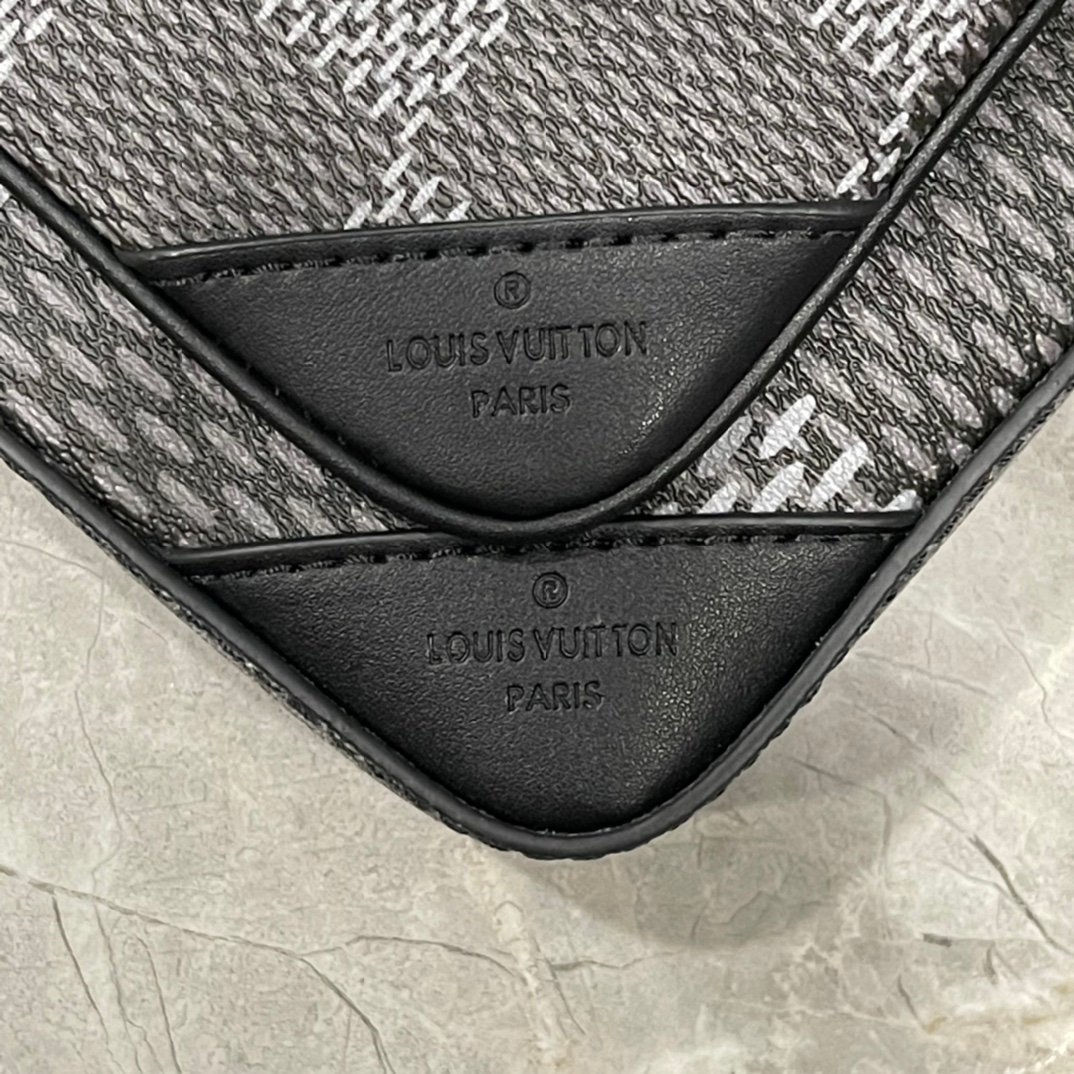 The upgraded versions M69443, M50017, M50027, M45320, and M69827. The new Trio messenger bag is made of Monogram Eclipse canvas and Monogram Eclipse Reverse canvas. The iconic monochromatic grey pattern highlights the lines of this multi-functional patchwork design. In addition to the functions of a traditional crossbody bag, it is also equipped with a detachable zipper bag and a coin purse attached to the strap. Dimensions: 25.0 x 18.5 x 7.0 cm.