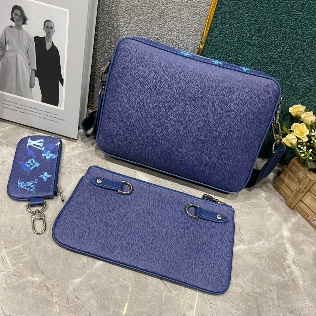 The upgraded versions M57840, M30848, M50068, M20665, M69443, and M45320. The new Trio messenger bag is made of Monogram Eclipse canvas and Monogram Eclipse Reverse canvas. The iconic tonal grey pattern highlights the lines of this multifunctional patchwork design. In addition to having the functions of a traditional crossbody bag, it is also equipped with a detachable zipper bag and a coin purse attached to the bag strap. Small bag: 12×7 cm. Medium bag: 24×15 cm. Large bag: 26×5×18 cm.