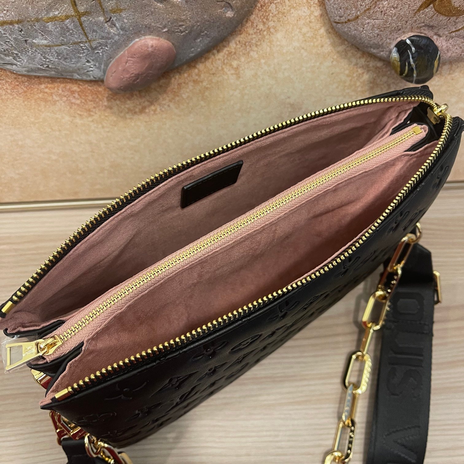 The top-of-the-line original M57793 57790 apricot Coussin small handbag shines at the Spring/Summer 2021 fashion show. Monogram embossed fluffy sheepskin creates a pillow configuration that injects avant-garde style into the minimalist design. Can be carried under the arm with a strap crossbody or an avatar chain baguette bag. Dimensions: 26 x 20 x 12 cm