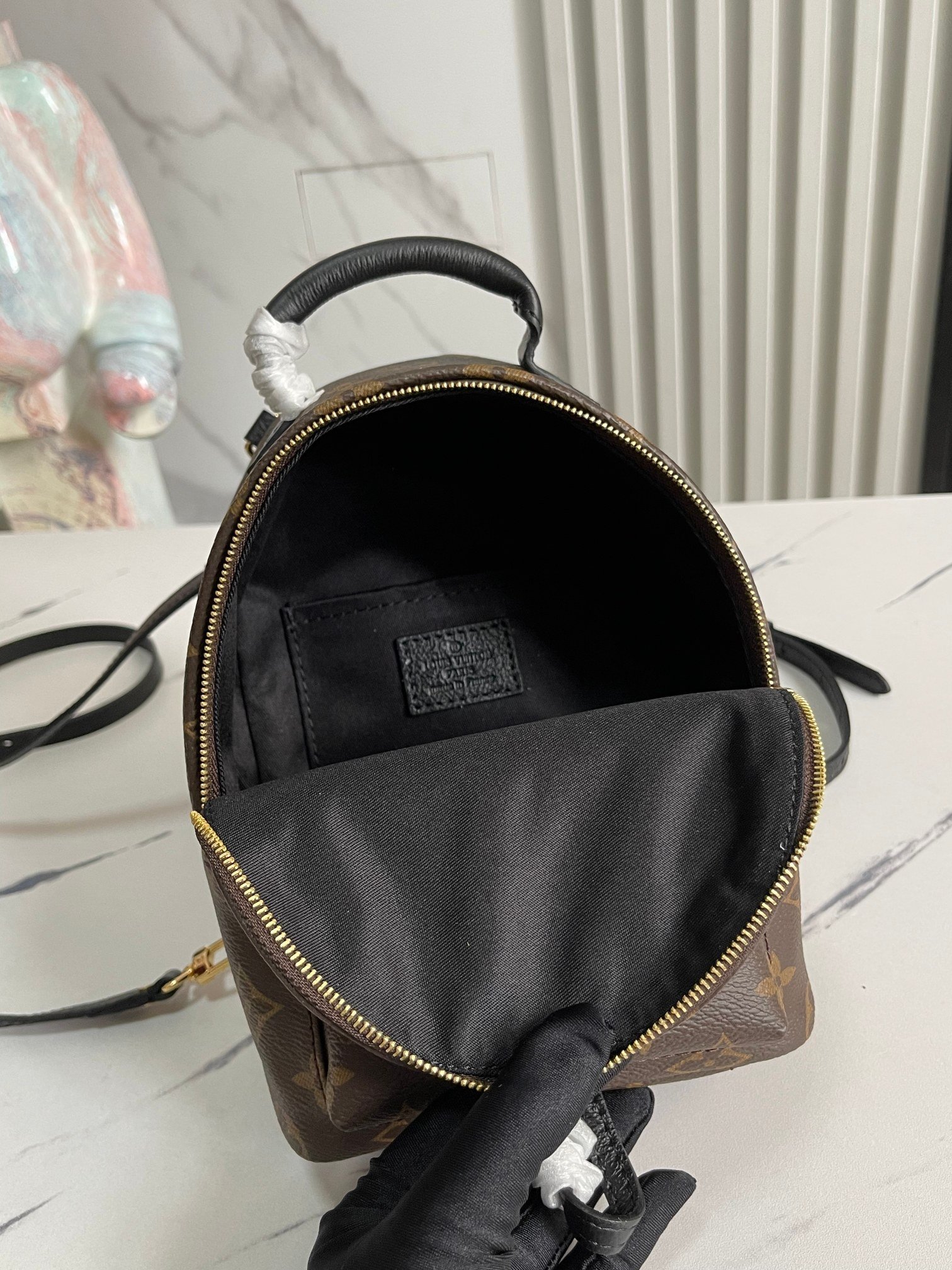 M44873 mini backpack MONOGRAM BACKPACK MINI backpack with colorful flowers Nicolas Ghesquière gives this backpack an amazing style change, transforming a simple daily necessities into a stylish and extremely attractive urban bag. This mini backpack made of soft Monogram canvas is petite and cute, with a multi-purpose strap for easy diagonal back Size: 15 × 22 × 9