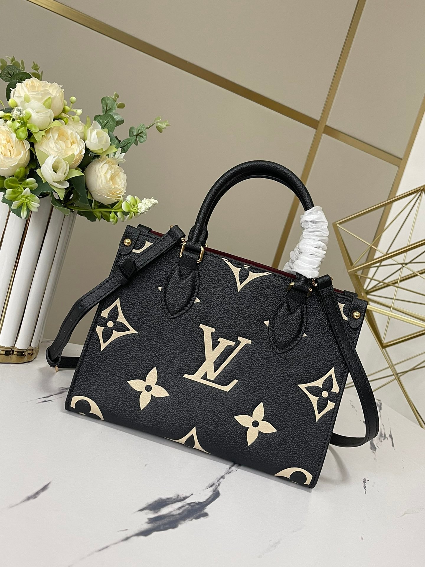 M45659 Onthego small Tote bag draws inspiration from the classic Sac Plat handbag in 1968. The Monogram Empreinte leather with the embossed Giant Monogram pattern creates a miniature version. It can hold daily necessities such as iPad Mini. The flexible handle and adjustable shoulder strap enrich the carrying options. Size: 25x19x11.5cm