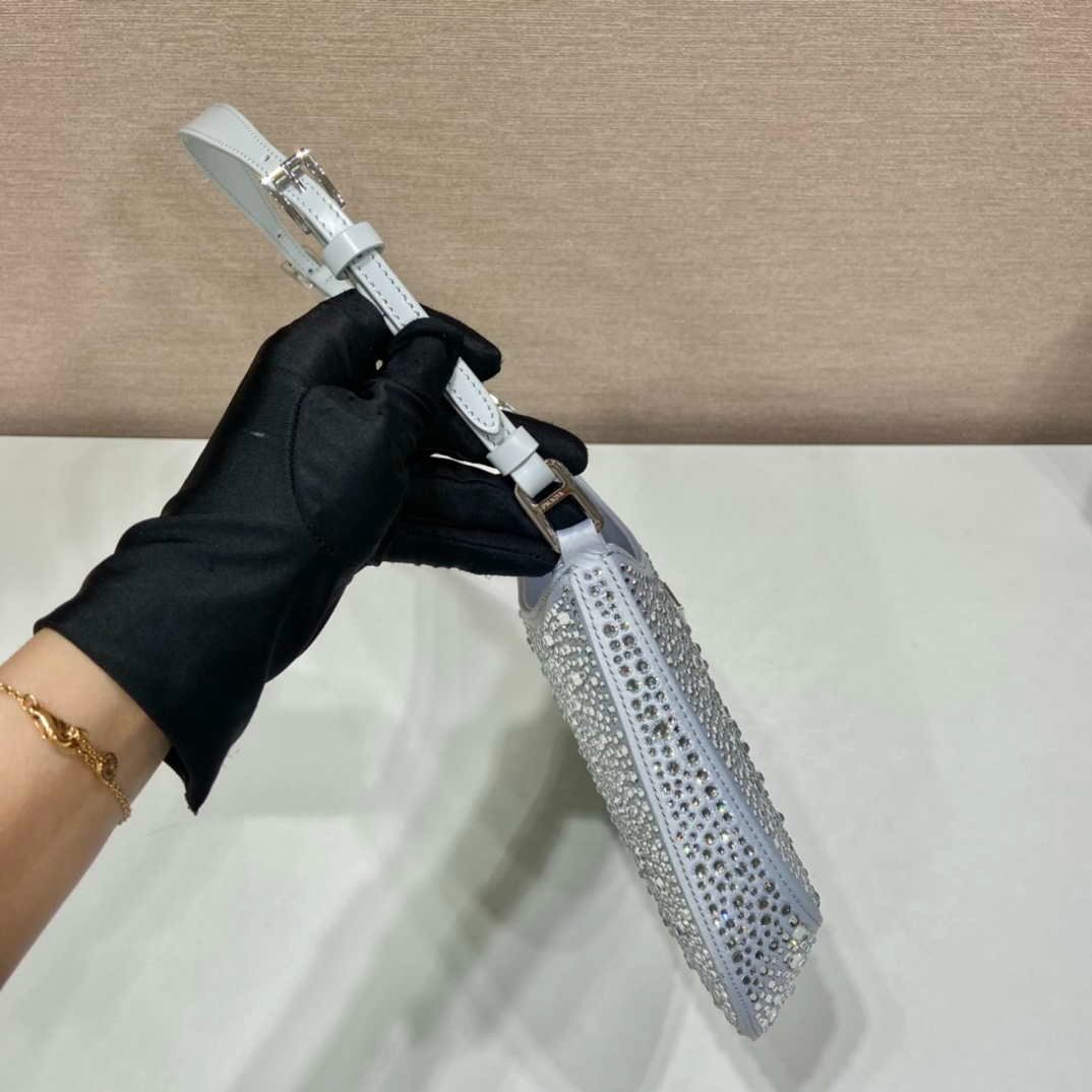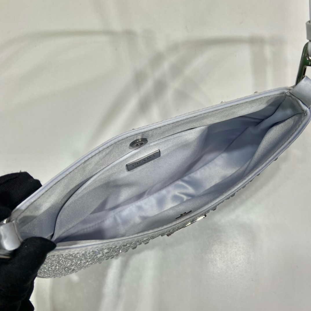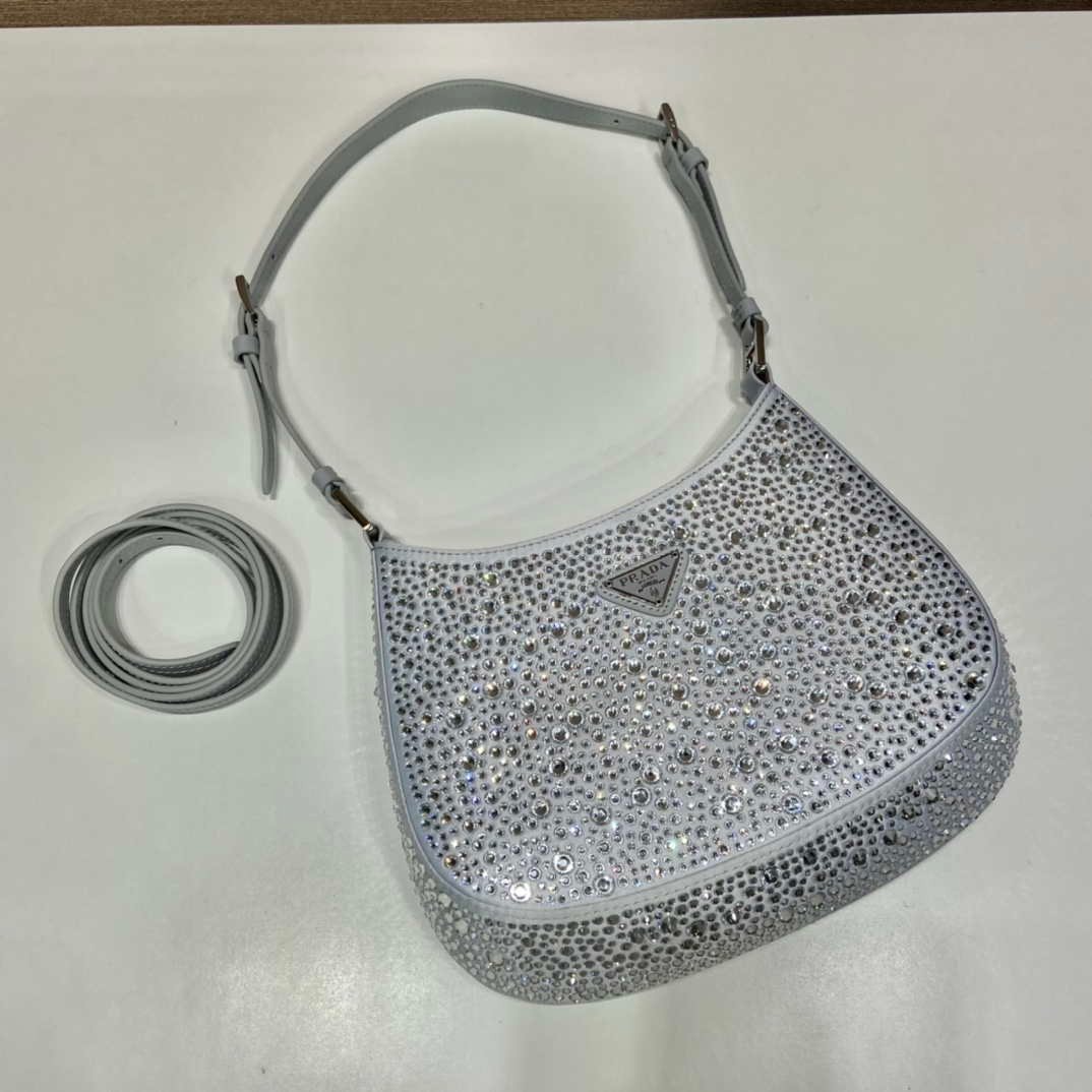 Feminine. elegant and modern. the Prada Cleo bag is made of satin and embellished with luminous crystals of different sizes that give the bag refined charm. The sinuous shape that recalls archive styles makes the accessory iconic.