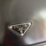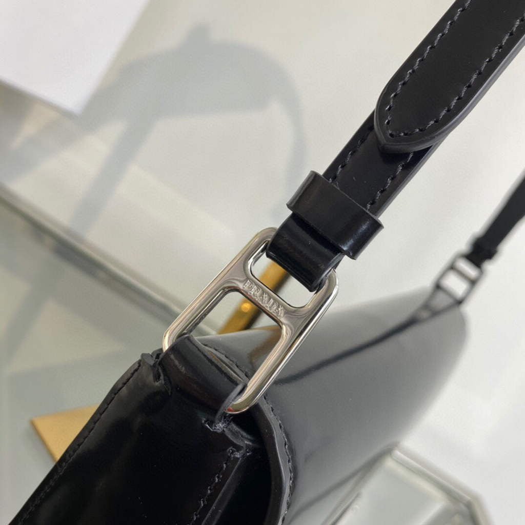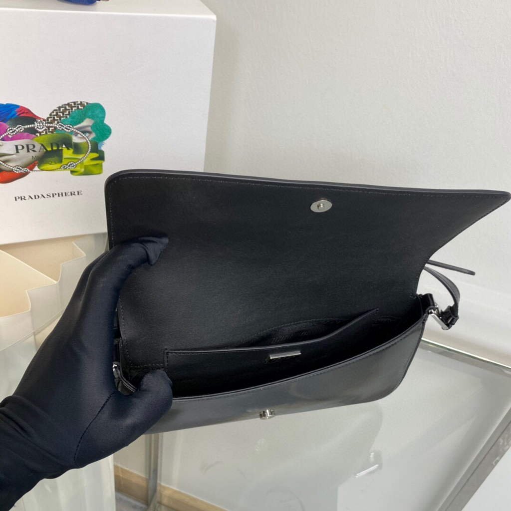 Minimalist elegance. a distinctive character and versatility meet in this shoulder bag with flap that reinterprets the geometric shape of the ’90s in a modern. current way. Made of fine brushed leather. an iconic material of Prada collections. the design with a horizontal line features a narrow adjustable shoulder strap that allows it to be worn as a crossbody or shoulder bag. The rectangular silhouette is decorated with the emblematic enameled metal triangle logo.