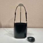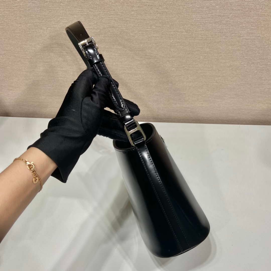 The bucket bag. a recurring design in Prada collections. comes in a mini version with modern allure. decorated with the enameled metal triangle logo and accented with a leather shoulder strap so it can be worn as a cross-body or shoulder bag. Fine brushed leather with its distinctive lustrous finish has been reinterpreted by Prada since the ’90s on unexpected designs for a hybrid result that reflects the duality of the brand.
