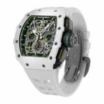 The Richard Mille Le Mans Classic White ATZ Ceramic Chronograph RM11-03 Replica is a high quality watch. It features a 904L stainless steel case with a transparent color and a white ceramic bezel. The movement is an automatic RMAC3 caliber with a power reserve of 60 hours and a precision of (-3/+3 sec/day) within COSC certification limits. The dial is silver with Arabic numerals and 904L stainless steel hour markers and hands.