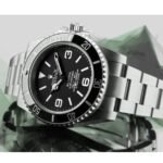 At the heart of the Rolex Blaken Submariner 6190 Replica is a robust 904L stainless steel case that exudes a powerful yet refined allure. The sleek black bezel complements the sophisticated black dial. creating a dramatic visual appeal that captures attention effortlessly. Protected by a sapphire crystal. the dial showcases mixed indices and hour markers. all made from 904L stainless steel. giving the watch a distinctive and polished look. The automatic caliber 3135 movement ensures seamless timekeeping with a commendable power reserve of 60 hours and precision within the COSC certification limits (-3/+3 sec/day). promising reliability and accuracy.