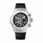 The Hublot Big Bang Unico Magic Sapphire 411.JX.1170.RX Replica is a luxury watch. It features a 904L stainless steel case and bezel. with a steel color. The crystal is made of Magic Sapphire. and the case is 45.00 mm in size. The bracelet is made of rubber. with an adjustable link for all sizes. The clasp is 904L stainless steel. with a fold clasp and steel color.