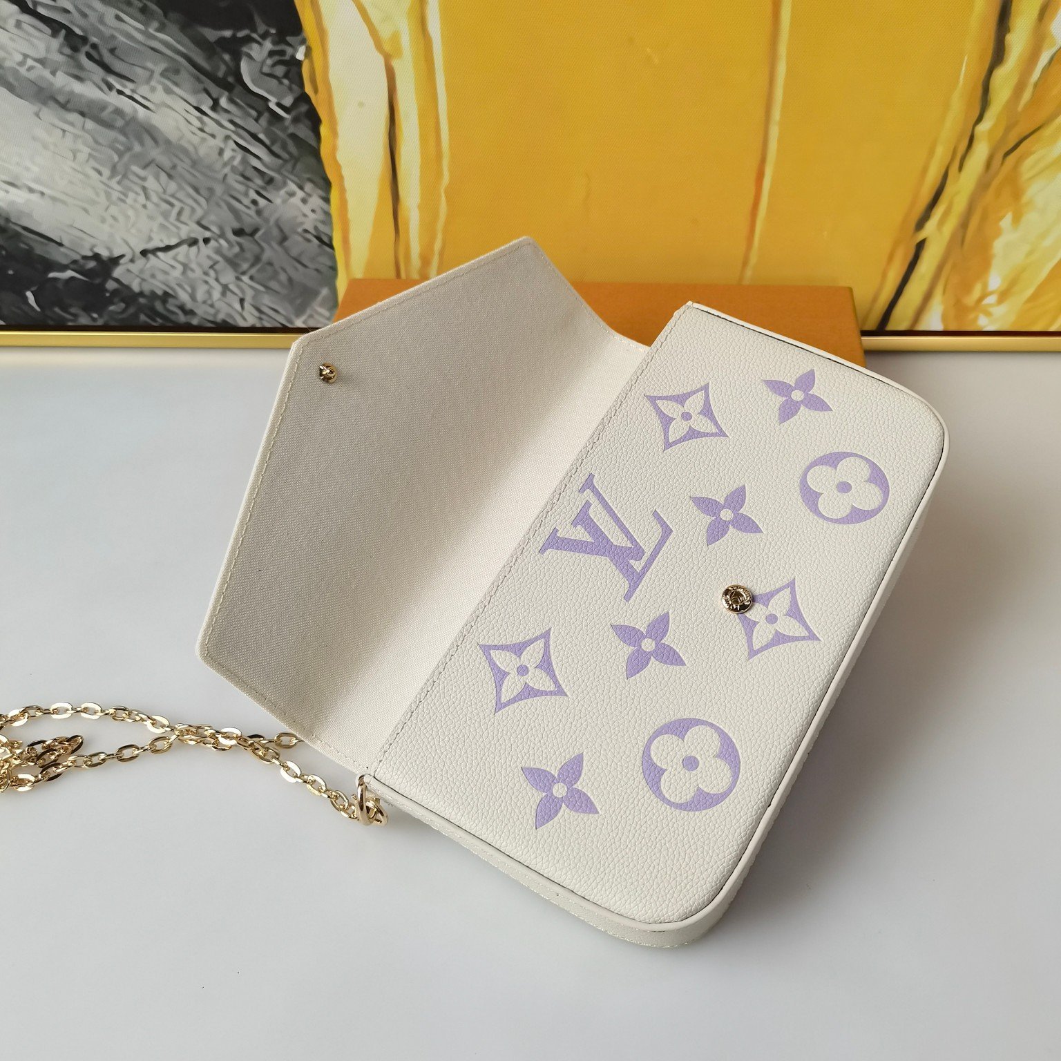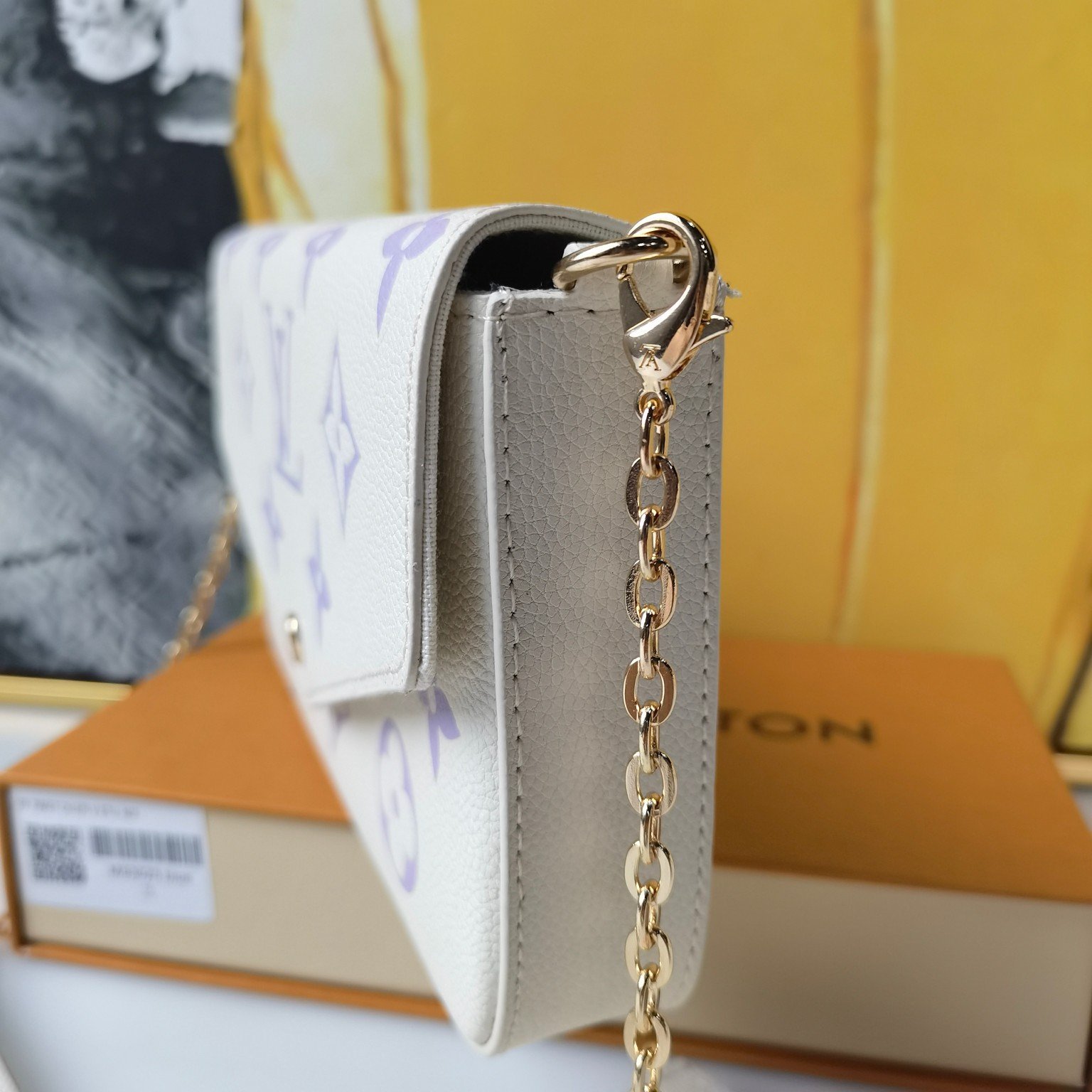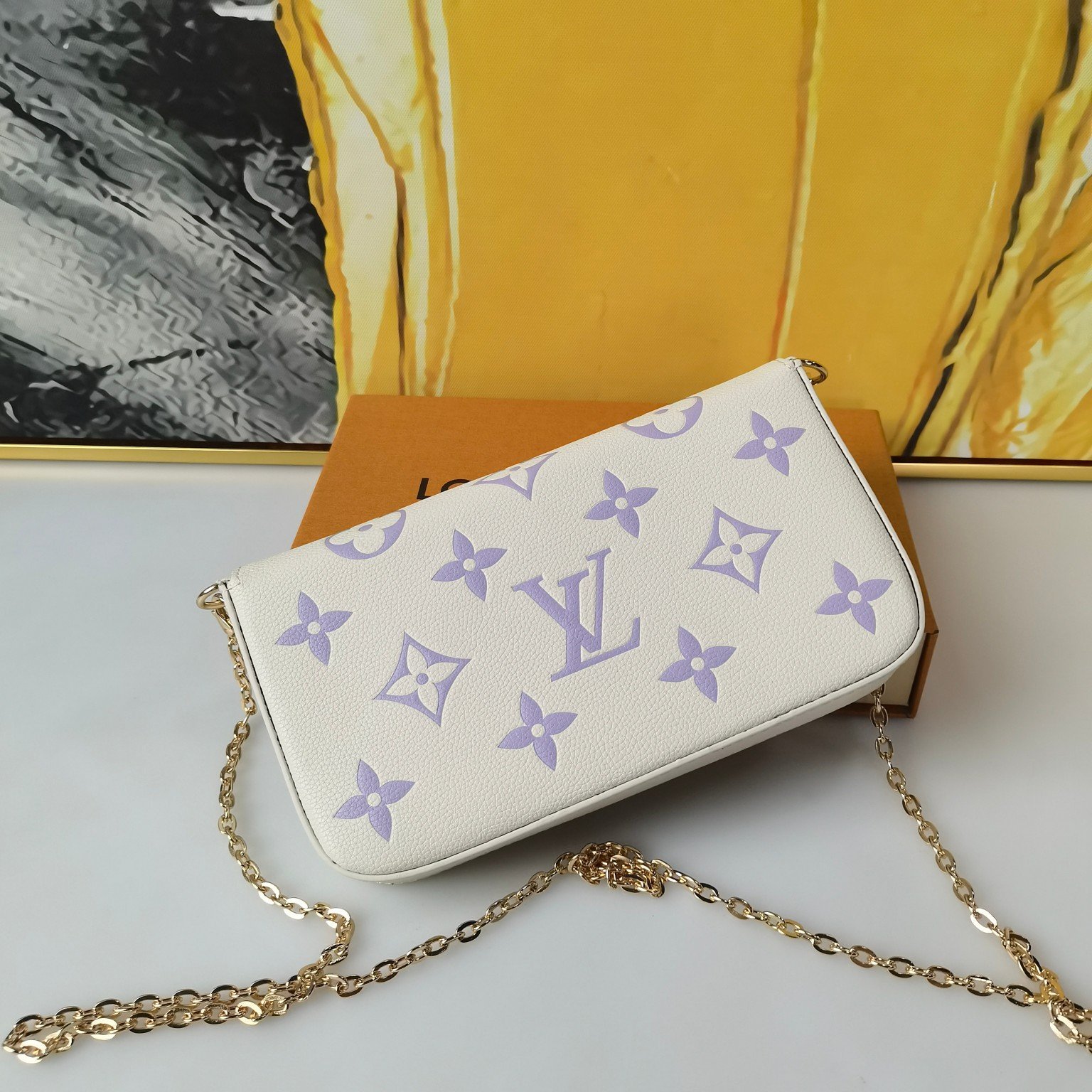 M83025 This season’s Pochette Félicie is reinterpreted in soft Monogram Empreinte leather. The soft two-tone color scheme highlights the embossed letter pattern. A stylish and versatile pouch comes with two removable pockets and a gold chain. You can use it as a shoulder bag or as a clutch after removing the chain. Size: 21*12*3cm.