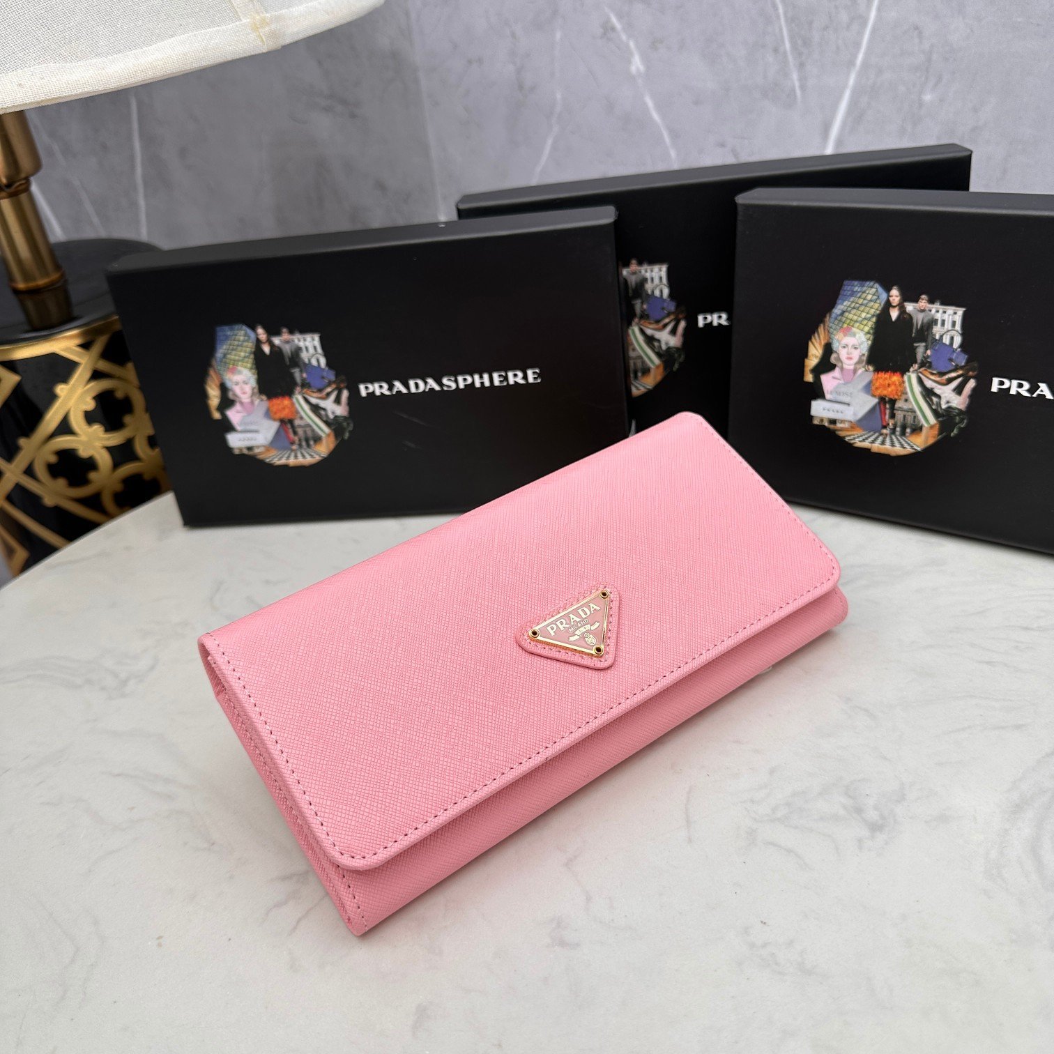 PRADA,👏👏 classic flap wallet with two compartments.💼 A classic piece, simple and fashionable. Made of top original cross-grained cowhide from Italy with excellent texture. Imported threaded lining. White steel metal hardware accessories! Exquisite stitching is evenly and neatly done. Exquisite workmanship. Size: 19x10x2.5. Color: glue-dripping triangular logo in plum red.
