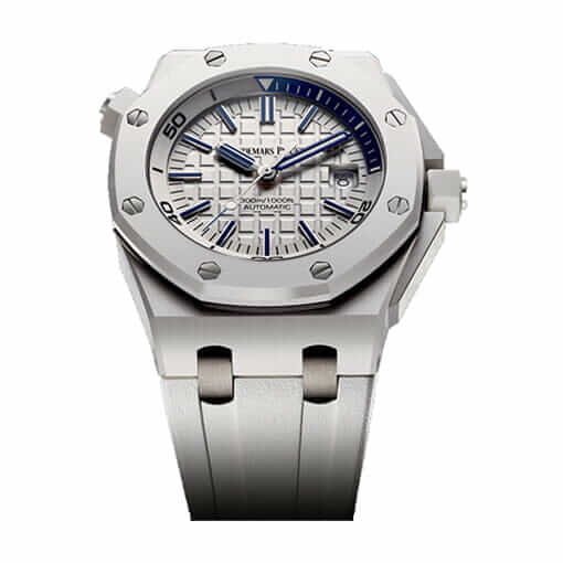 This Audemars Piguet Royal Oak 15710ST.OO.A010CA.01 replica watch is a perfect 1:1 clone of the original. It features a 904L stainless steel case and bezel. a white rubber bracelet. and a white dial with stick and dot indices. The movement is an automatic AP 3120 caliber with a power reserve of 60 hours and a precision of (-3/+3 sec/day) within COSC certification limits. The watch also has a sapphire crystal. an AP folding clasp. and a moonphase function.